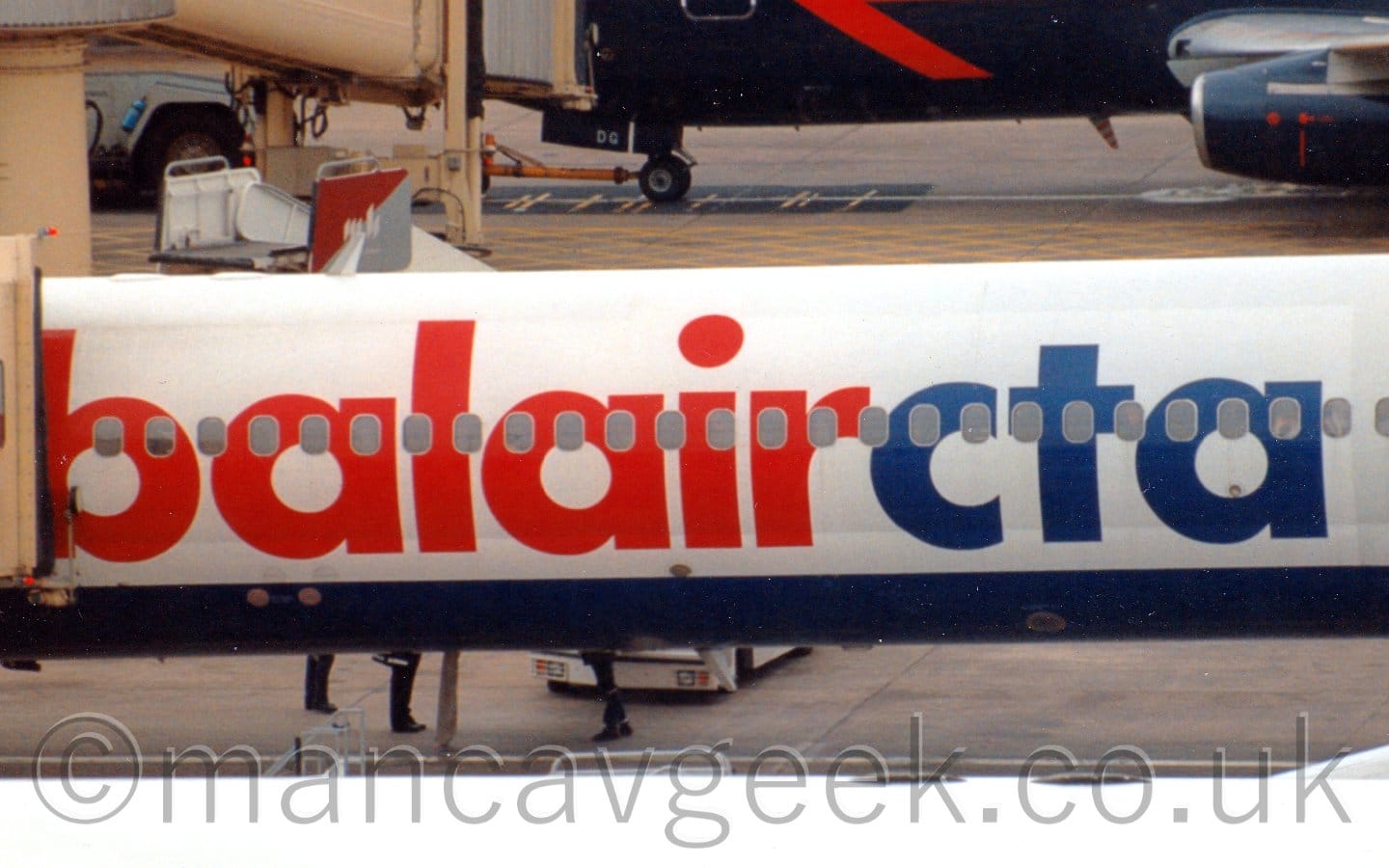HB-IN_, or IU_, McDonnell MD82 or MD87, BalAir CTA, parked on Gate 24 at Manchester Airport, some time in the 1990s, as seen from the top of the T1 car park.